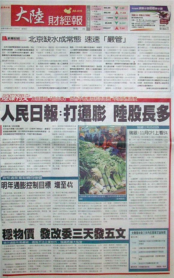 中共官方媒體人民日報昨(24)日發表文章指出,儘管目前通膨趨勢明顯,但大陸有抑制通膨的雄厚物質基礎,且抑制通膨對股市是長期利多,市場不應反應過度。