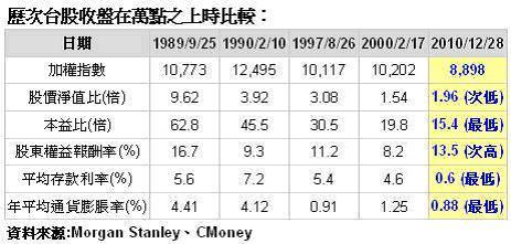 明年元月起ECFA早收清單將正式上路,對照香港和中國簽署CEPA後,港股走向長線大多頭,恆生指數從2003年至2007年間波段漲幅高達278%來看,台股啟動未來黃金十年已進入倒數,摩根富林明投信認為,台股擁有全球獨有的兩岸開放題材、資金面動能無虞,且目前本益比、股價淨值比相對過去萬點時都相對便宜,搭配明年經濟成長率將逐季走高,市場普遍認為兔年挑戰萬點有望,2011年台股有機會揚眉「兔」氣。