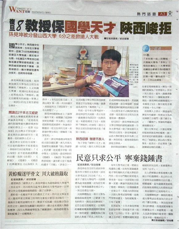 國學小天才」陝西高中生孫見坤,今年在大學考試中,因差了6分 而與他嚮往的復旦大學無緣。基於惜才心態,8名復旦大學教授日前 聯名請求學校破格錄取,但陝西省招辦硬是不買帳。孫見坤表示,離 大學報到還有20多天,他將等待奇蹟。