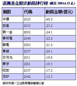 羅淑蕾指出,退撫基金歷史虧損金額驚人,經查截至2004年 6月15日止,操作虧損前10名個股分別為:中環、宏碁、第一金、華邦電、聯電、華碩、日月光、華宇、旺宏、茂矽。
