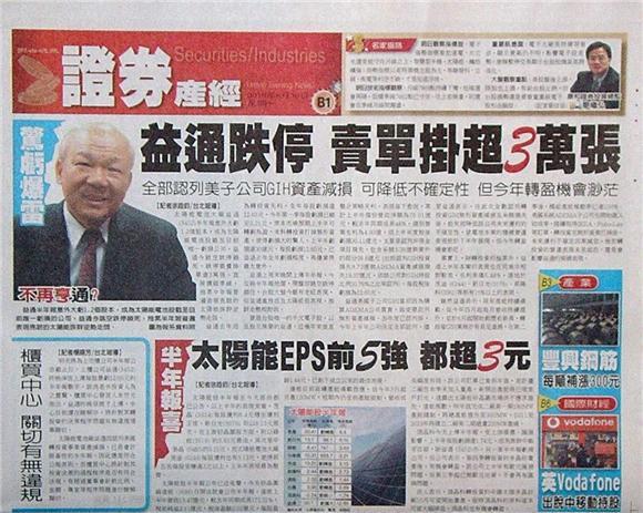 太陽能電池大廠益通 (3452)半年報意外大虧1.2個股本,成為太陽能電池股截至目前唯一虧損公司,益通今跳空跌停鎖死,跌停委賣掛單逾3萬張,直接摜破季線,拖累半年報普遍表現亮眼的太陽能族群逆勢走弱。