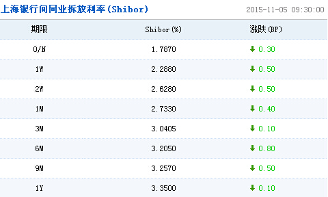 上海銀行間同業拆放利率(Shibor)顯示,隔夜Shibor報1.7870%,下跌0.30個基點;7天Shibor報2.2880%,下跌0.50個基點;3個月Shibor報3.0405%,下跌0.10個基點。