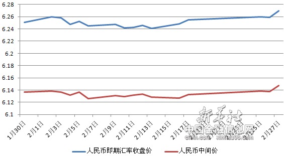 北京(CNFIN.COM / XINHUA08.COM)--2月27日,人民幣兌美元即期匯率盤中再度逼近“跌停”,最終大跌近百基點。由於春節假期,本周只僅有三個交易日,人民幣即期匯率本周累計跌幅為0.23%,全月下跌0.30%,為連續4個月下跌。