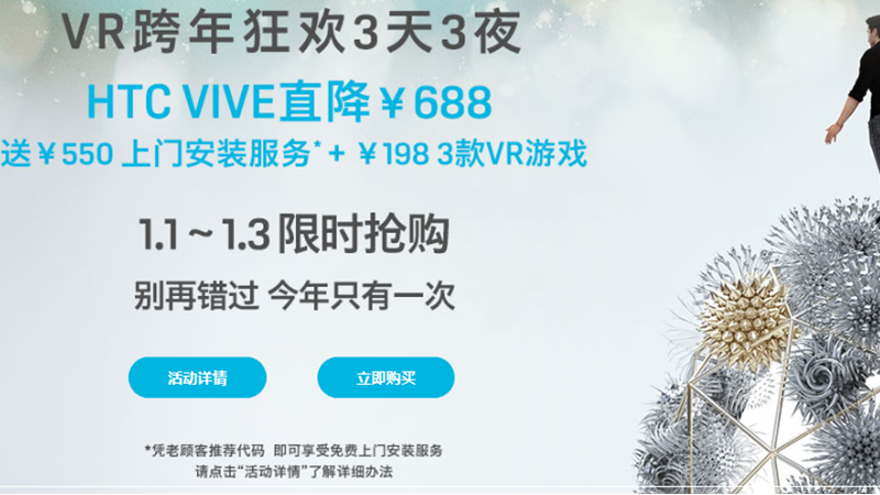 Vive 2 何時發表引來市場關注及猜測,宏達電在耶誕節及元旦則是相繼推出 Vive 降價促銷活動,兩岸都有促銷的活動,中國官網推出限時降價,Vive 售價由人民幣 6888 元直降到人民幣 6200 元,調降人民幣 688 元,降幅達 1 成,同時還加送人民幣 550 元到府安裝和人民幣 198 元 3 款熱門遊戲。