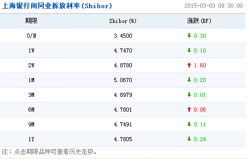 上海銀行間同業拆放利率(Shibor)顯示,隔夜Shibor報3.4500%,下跌0.30個基點;7天Shibor報4.7470%,下跌0.10個基點;3個月Shibor報4.8979%,下跌0.01個基點。