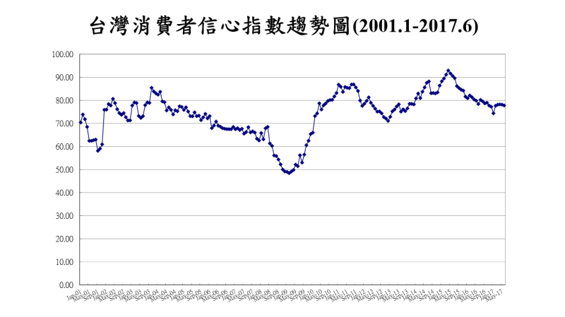 中央大學台灣經濟發展研究中心今 (27) 日公布 6 月消費者信心指數 (CCI) 調查的總數為 77.76 點,較上月下滑 0.35 點,是 4 個月以來低點;本次調查中,6 項指標有 3 項下滑,以「未來半年投資股票時機」下滑最多,創 3 月以來低點。