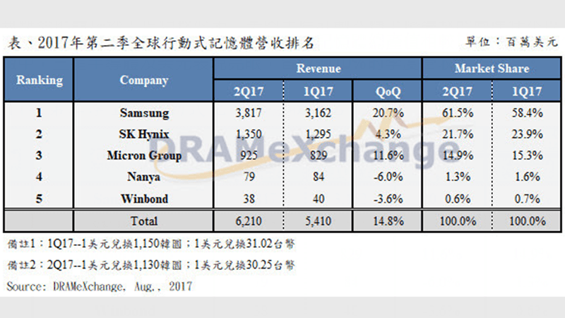 DRAMeXchange 表示,以第 2 季行動記憶體營收市占來看,三星半導體重新站回以往 6 成以上的市占水平;SK 海力士在營收市占表現上雖然較第 1 季衰退 2.2 個百分點,但依舊穩坐第二名寶座;美光集團隨著經營策略的調整,日益重視在智慧型手機領域的表現,已反應在美光連續兩季的季度營收市占率都有 15% 左右的成績。