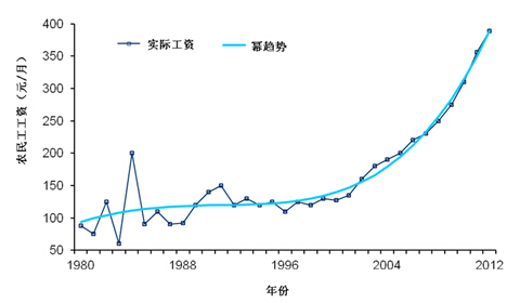 數據來源:盧鋒《就業擴張與工資增長(2001-2010年)》,北京大學中國宏觀經濟研究中心,2011年。該數據截止期為2010年,蔡昉根據國家統計局的數據更新至2012年