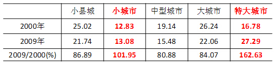 在2000年—2009年的十年間,特大城市的人口比重提高了62%,小城市的人口比重基本不變,而其他三種類型的城市人口比重都出現下降,也就意味著中國城鎮化的路徑並不均衡,而是呈現出“農村—小城市—特大城市”的三級跳的特征,因此特大城市的發展仍將成為下一步城鎮化的重點,對於目前出現的“大城市病”的問題,筆者堅持認為更多源於城市管理不當。因此特大城市的基礎設置投資,比如垃圾處理、公共交通、城市道路、地下管網、清潔用水等,仍將是可以重點關注的投資方向。