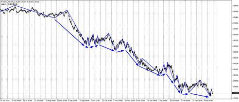 分析:上周市場先下后上,周一高點0.7740,周三低點0.7560,波幅180點,與上周分析對比高點誤差31個點,低點誤差65個點,方向分析錯誤。根據中謙交易系統分析,市場向上的力量非常弱,短期內市場可能走出小幅震盪的行情。本周市場震盪平移,高點0.7738,低點0.7530,波幅約208點。