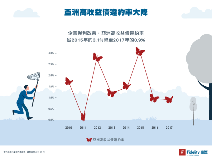 雖然美國聯準會緩步開啟升息循環,但全球資金仍是非常寬鬆,企業利息壓力因而下降,對亞洲高收益債的發行企業就是一大利多。加上經濟復甦的腳步持續大步往前邁進,不僅歐美持續復甦,亞洲經濟也有後來居上之勢。亞洲企業在歐美需求拉抬下,企業獲利也一躍而起。資金寬鬆加上企業獲利提都有助於亞洲高收益債違約率的降低,亞洲高收益債的違約率從 2015 年的 3.1% 下滑至 2017 年 0.9% 的低水準。(資料來源: 摩根大通證券,2018.1 月)