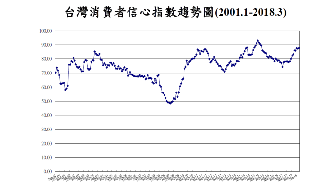 中央大學台灣經濟發展研究中心今 (27) 日公布 3 月消費者信心指數 (CCI) 調查總數為 87.86 點,較上月上升 0.48 點,並創 2015 年 8 月新高,6 項指標僅「國內物價水準」下跌,來到 7 個月以來低點,而上升幅度最大的是「投資股票時機」。