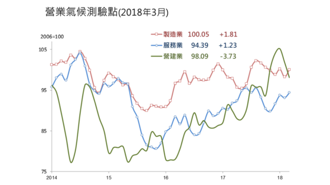 台灣經濟研究院今 (25) 日公布 3 月營業氣候測驗點調查,製造業為 100.05 點,月增 1.81 點,服務業也增加 1.23 點至 94.39 點,並創 7 個月來高點,僅營建業為連續 2 個月下跌至 98.09 點,月跌 3.73 點。