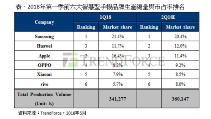 根據 TrendForce 最新報告,目前中國手機四大品牌的排名依序是華為、OPPO、小米、vivo,今年第 1 季分別位居全球智慧手機市占第三名到第六名;TrendForce 指出,第 1 季以中國各品牌表現來看,華為智慧型手機生產數量仍居中國之冠,全球排名僅次於三星、蘋果。