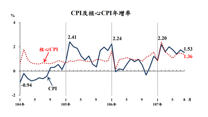 主計總處今 (5) 日公布 8 月消費者物價指數 (CPI) 年增率 1.53%,較上月年增率 1.75% 回落 0.22 個百分點,儘管物價回跌,不過菸價大漲和油價持續處在高檔,對物價造成一定的上漲壓力;前 8 月平均年增率 1.64%,仍在台灣央行防守的 2% 通膨上限之下。