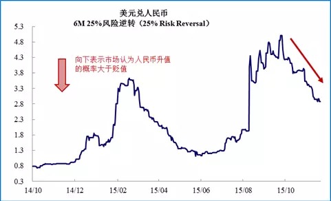 自811央行主動引導人民幣大幅貶值后,市場對於人民幣貶值預期一度上升。但從近期數據來看,盡管聯儲12月加息預期在10月非農就業數據大幅超預期后明顯上升,但市場對於人民幣貶值預期反而在10月以后持續回落,意味著市場對於人民幣的擔憂在下降。而從央行角度來看,在811后為引導預期回升,貨幣當局曾干預在岸和離岸人民幣市場,而這種干預也逐漸趨於正常化。近日,在岸人民幣匯率即期匯率相對中間價價差的波幅略有收窄,同時央行也並未單向大幅調整人民幣中間價。