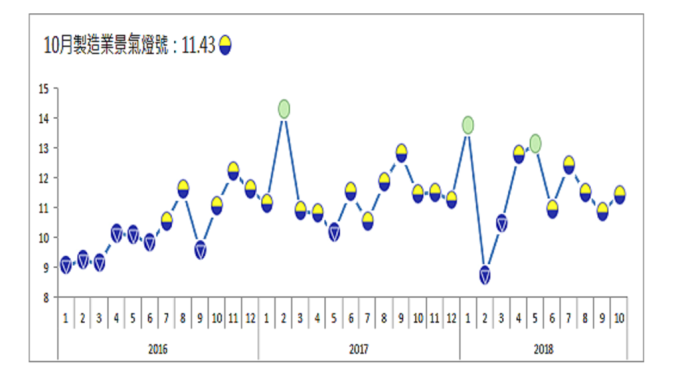 台灣經濟研究院今 (29) 日公布 10 月製造業景氣信號值增加 0.54 分至 11.43 分,但燈號仍連續第 5 個月呈現黃藍燈,從不同產業來看,藍燈比重仍與上月占達 40% 差異不大,但綠燈一口氣增加近 15 個百分點至 20% 以上,部分產業表現相對熱絡。