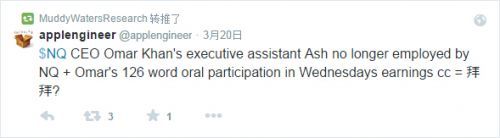 渾水轉推的消息的發布者為名為“@applengineer”,后者在Twitter上稱:“網秦聯席CEO Omar Khan的首席助理Ash已經不受雇於網秦,另外,Omar在上周三的財報分析師會上總共只有126個字的發言,是不是也要和網秦拜拜呢?”