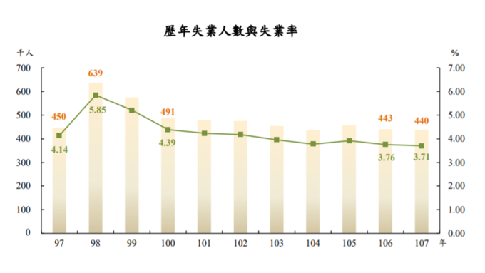 主計總處今 (22) 日公布去 (2018) 年失業率平均為 3.71%,不僅較前一年度續減 0.05 個百分點,也是 2001 年以來新低,全年平均失業人數為 44 萬人,年減 3000 人,主計總處說明,自 2009 年金融海嘯後,失業率呈穩定下滑趨勢。