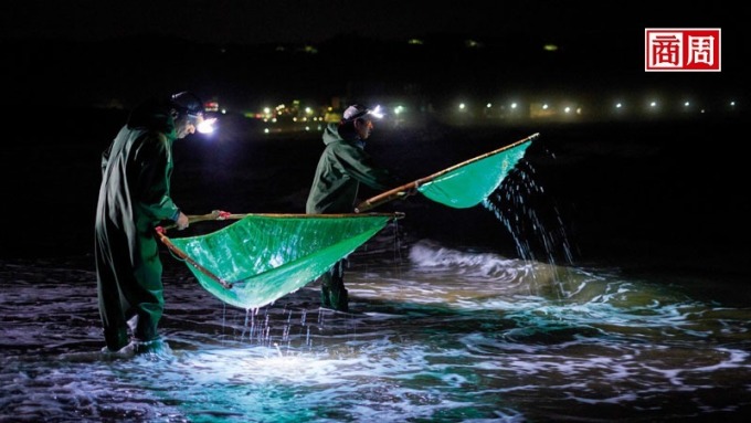 冬季大潮時是重要的捕撈日,漁民會換上青蛙裝、頭戴探照燈、手持三角網上工。許修逸說:「時間是關鍵,漲潮 1 小時後,是俗稱的三分潮,為最佳捕撈時間。」過去用俗稱的「手扒網」,但體積大又重,工作較吃力,這幾年三角網出現,讓漁民省力不少。
