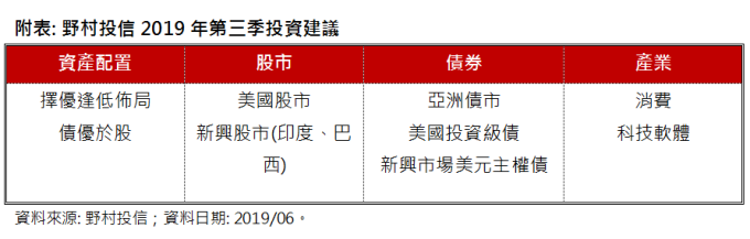 第二季美中貿易戰再度升溫,金融市場波動度升高,雖然投資人看好 G20 峰會所帶來的正面訊息,但股市高波動已成常態;另一方面,全球經濟數據表現疲弱,美債殖利率一路下滑,市場預估今年降息機率大增,帶動債市一枝獨秀,面對瞬息萬變又充滿不確定性的市場,該如何追求收益機會? 野村投信表示,第三季仍會以大區間波動為主,債市表現機會優於股市,建議選擇優質標的並逢低佈局,股市方面看好美股以及新興股市的印度與巴西;債市則看好亞洲債市、投資級債以及新興市場主權債。
