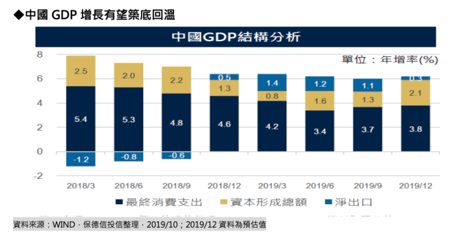 今年以來,人行持續推進去槓桿,壓抑市場風險情緒,但近期中國政府將於 12 月下達 1.29 兆人民幣的專項債,財政政策持續擴容,加上明年春節前降準和逆周期調控預期,有望緩解中國經濟下行力道,第四季 GDP 成長可望回升。(資料來源:Bloomberg,2019/11,保德信投信整理)