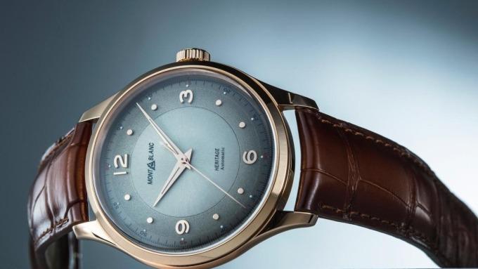 萬寶龍「傳承系列」自動錶款,其復古風煙燻面盤上的多層次色澤,以及清楚標示的 Heritage 字樣,說明這個錶款的設計來自於歷史的啟發。