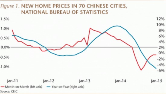 按同比計算,1月新建住宅均價較去年同期下滑5.4%。房價已經連續5個月出現同比下滑。由於基數效應(去年1月房價同比上漲逾9%,且一直到2014年5月每個月的同比漲幅均超過5%),即便房價環比跌幅繼續收窄,未來幾個月房價同比下跌情況也將繼續惡化(參照下圖)。