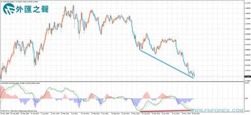匯價於2015年3月11日錄得0.7559一線的新低,該低點是2011年7月24日高點1.1079下跌以來的新低。我們現在不能武斷的說,澳元/美元0.7559的低點就是下跌的結束點。但是,周線圖macd指標在零軸下方已經形成金叉,並且k線圖與macd指標形成長達83周的底部背離。0.7559是今日值得關注的重要支撐價格,macd指標能否在零軸下方形成金叉后延續開口向上的運行也是值得投資者密切關注的重點。