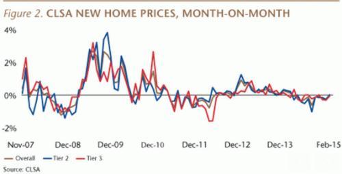 與去年同期相比,CLSA數據顯示截至2月新建住宅價格已經連續下滑6個月,與國家統計局調查的趨勢相符。2月房價同比下滑2.1%,相比之下,1月同比下滑1.9%、去年12月同比下滑1.4%、去年11月1.2%、去年10月1%、去年9月0.7%。