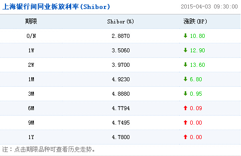 上海銀行間同業拆放利率(Shibor)顯示,隔夜Shibor報2.8870%,下跌10.80個基點;7天Shibor報3.5060%,下跌12.90個基點;3個月Shibor報4.8880%,下跌0.95個基點。