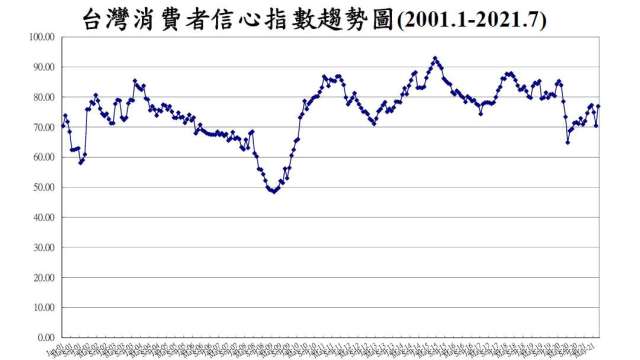 中央大學台灣經濟發展研究中心今 (27) 日公布 7 月消費者信心指數 (CCI) 調查總指數為 76.92 點,較上月上升 6.44 點,不僅終結連 2 跌,也來到 3 個月來高點,其中六項調查指標皆上升,以「未來半年購買耐久性財貨時機」上升幅度最大,而多數指標均是 3 個月來高點,顯示本土疫情造成的消費者信心衝擊正在逐步回穩。