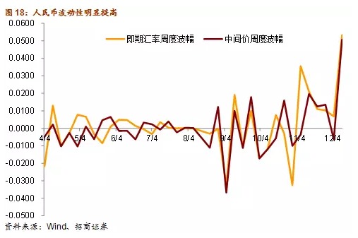 另一方面,人民幣匯率制度更加市場化也將削弱三元悖論下的利率傳導渠道。今年8月11日中國再次進行匯改,本次匯改最大的亮點是增加了人民幣中間價的彈性,同時大幅弱化了人民幣盯住美元的程度。12月11日中國正式推出人民幣匯率指數,此舉央行更加重視人民幣兌一籃子匯率的穩定。因此,在新的匯率形成機制下,美元兌人民幣匯率的波動性將明顯上升。從三元悖論的角度出發,當央行允許美元兌人民幣匯率波幅進一步擴大,那么中國將會提高本國貨幣政策相對於美國貨幣政策的獨立性。