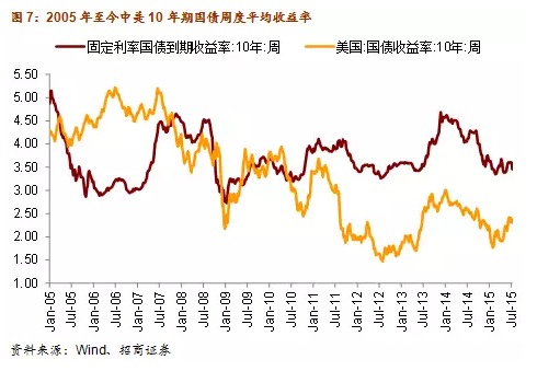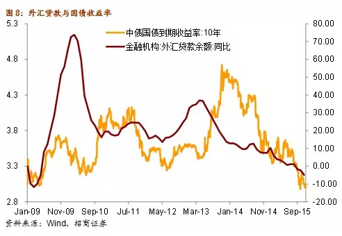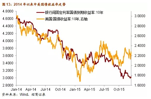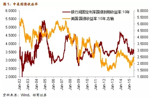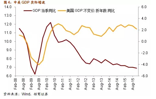 換言之,由於中美兩國目前處於不同的經濟和政策周期,美國經濟向好,2016年將繼續加息,而中國經濟2016年GDP增速還將繼續下滑,貨幣政策仍有降息空間。當人民幣放松對美元的盯住后,中美兩國的債券收益率一同走高的可能性就會低於811匯改前。