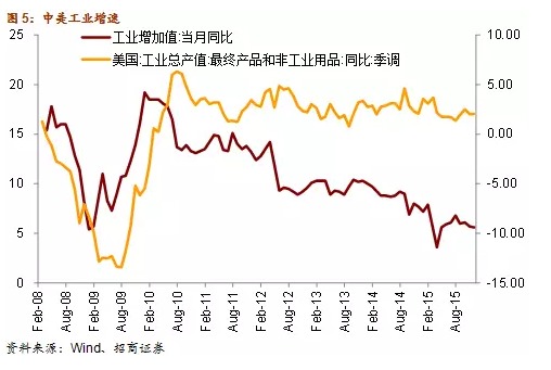 圖3和圖4反映的是中美兩國GDP增速和工業產值自2008年以來的走勢情況。這兩組衡量實體經濟的指標都顯示過去5年多的時間以來,中美經濟周期是大致趨同。危機時期中美經濟同時失速,隨后在“4萬億”投資計劃和量化寬鬆政策的刺激下,兩國經濟逐步企穩回升。