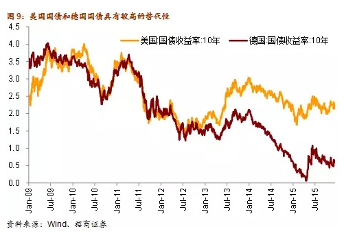 對於一個參與全球債券市場的投資者而言,不同國家的國債品種存在著相互替代的關係。例如,過去兩年,通縮風險和歐洲央行超寬鬆政策預期推動德國國債收益率持續走低,中短期國債收益率一度跌至負利率,10年期國債收益率也創下歷史新低,一度跌至0.05%以下。而同一時期美國10年期國債收益率大致在2.0%附近,美國國債的價格優勢便立刻凸顯出來,因此全球設定的債券投資者對美債需求將會上升,從而推動美債收益率的下行。