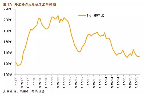 目前人民幣和美元強弱易勢。人民幣接近均衡匯率后,貶值預期逐步發酵,這將抑制國內企業繼續增加美元負債。過去,國內有大量房地產企業由於國內融資方面的限制,不得不在境外融資,這一限制在今年三季度被取消。加之國內持續降息,地產企業完全可以在國內以相對合理的成本進行融資。我們可以明顯看到,美元升值預期出現后,國內企業加快了美元去杠桿進程,外匯貸存比2014年以來大幅下降。