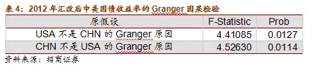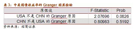 協整檢驗的結果表明,在5%的顯著性水平下,中美兩國國債收率在長期存在惟一的均衡關係。我們現在想知道的是這種均衡關係是否構成因果關係。這個問題可以通過Granger因果檢驗求得答案,檢驗結果如下: