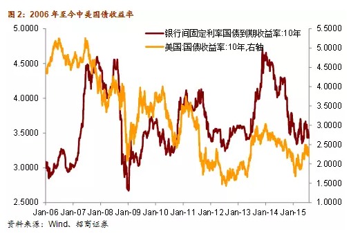 2013年美聯儲加息預期首度發酵,全球金融市場出現劇烈波動。進入2014年,中國經濟持續下行,年末中國央行開啟降息操作。反觀美國,盡管數據依舊參次不齊,但經濟向好的大趨勢並未改變,2015年以來的聯儲議息會議進一步提高了美聯儲將在今年晚些時候開啟新一輪加息周期的可能。可見,自美聯儲結束量化寬鬆操作后,中美兩國的經濟和政策周期已經開始分化,然而,2013年至今中美10年期國債收益率走勢反而進一步趨同,這顯然說明除了經濟和政策周期之外,還存在其他因素影響著兩國國債利率的變動。