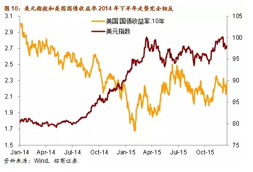 換言之,美德兩國國債具有較高的替代性,一般情況,價格優勢將成為全球債券投資者決定資金投向的重要考慮因素。正如微觀經濟學中的替代商品一樣,替代性越高的金融資產,其資產價格的變化趨於一致的可能性越高。美德兩國國債收益率具有較為明顯的聯動性。國債替代性可能正是2014年下半年美元指數走強后,美債收益率遲遲未能上行的重要因素。