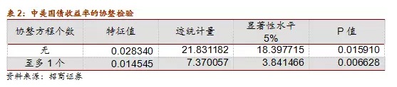 雖然我們可以對中美兩國十年期國債收益率一階差分后再進行回歸以確定兩個時間序列之間的回歸關係,但差分會損失大量有效資訊,因此我們用協整檢驗確定兩國長債收益率是否在長期確定均衡關係,以避免資訊損失的問題。協整檢驗方法我們采用Johansen協整檢驗,根據AIC準則確定的滯后階數為4,結果如下: