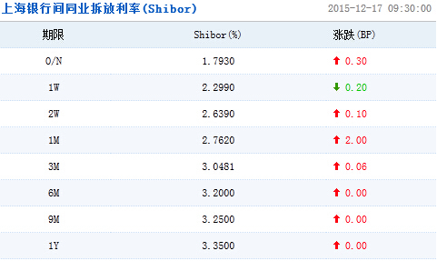上海銀行間同業拆放利率(Shibor)顯示,隔夜Shibor報1.7930%,上漲0.30個基點;7天Shibor報2.2990%,下跌0.20個基點;1個月Shibor報2.7620%,上漲2.00個基點;3個月Shibor報3.0481%,上漲0.06個基點。