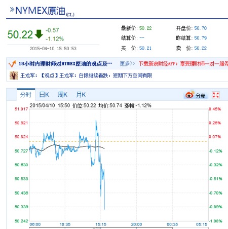 新浪財經訊 北京4月10日下午消息 受美元強勁反彈影響,NYMEX原油小幅跳水,下跌0.57美元,跌幅達1.12%,報每桶50.22美元。布倫特原油下跌0.28%,報每桶57.54美元。
