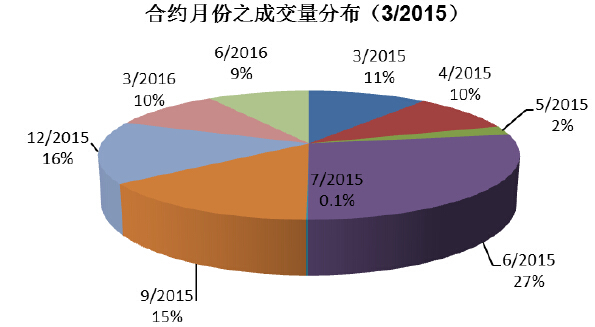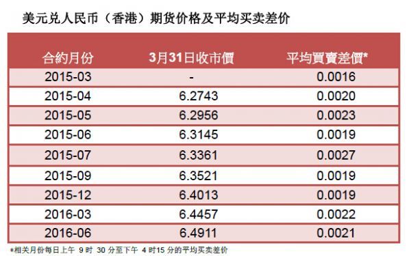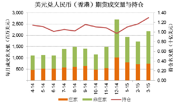 數據顯示,2015年3月31日美元/人民幣(香港)期貨未平倉合約增至12949張 (名義合約價值13億美元),較上月增加11%。其中,今年6月及12月合約的未平倉合約占3月底所有未平倉合約的50%。