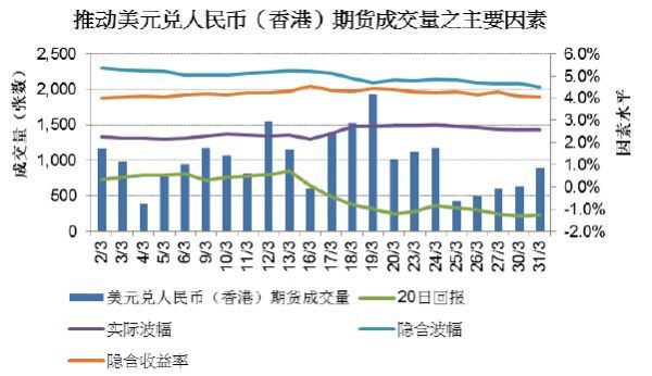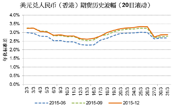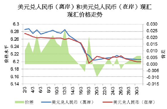 3月美元兌人民幣(香港)期貨的波幅為2%至3.5%。3月底離岸和在岸人民幣兌美元的價差收窄至少於0.005,離岸人民幣兌美元造價低於在岸人民幣。