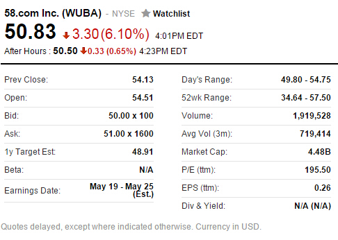 58同城股價北京時間昨夜美股開盤時微走高,盤中下行趨勢明顯,最低時跌至49.8美元,跌幅超7%,最終報收於50.83美元,跌幅為6.1%,市值損失近3億美元,常規交易量約192萬股。