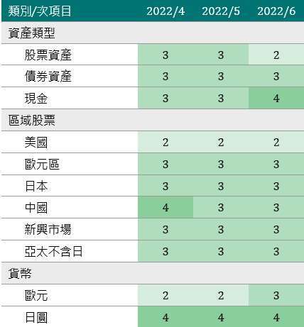 將美國公債配置由中性調高至增持,中公債券由增持下調至中性,歐元高收益債由中性調至減持,歐元由減持上調至中性,人民幣由中性下調至減持。