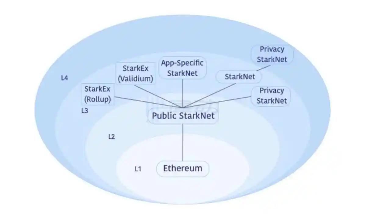 4、隱私 StarkNet 實例(在此示例中也作為 L4)允許隱私保護類型的交易存在,而不將它們包含在公共 StarkNet 中。