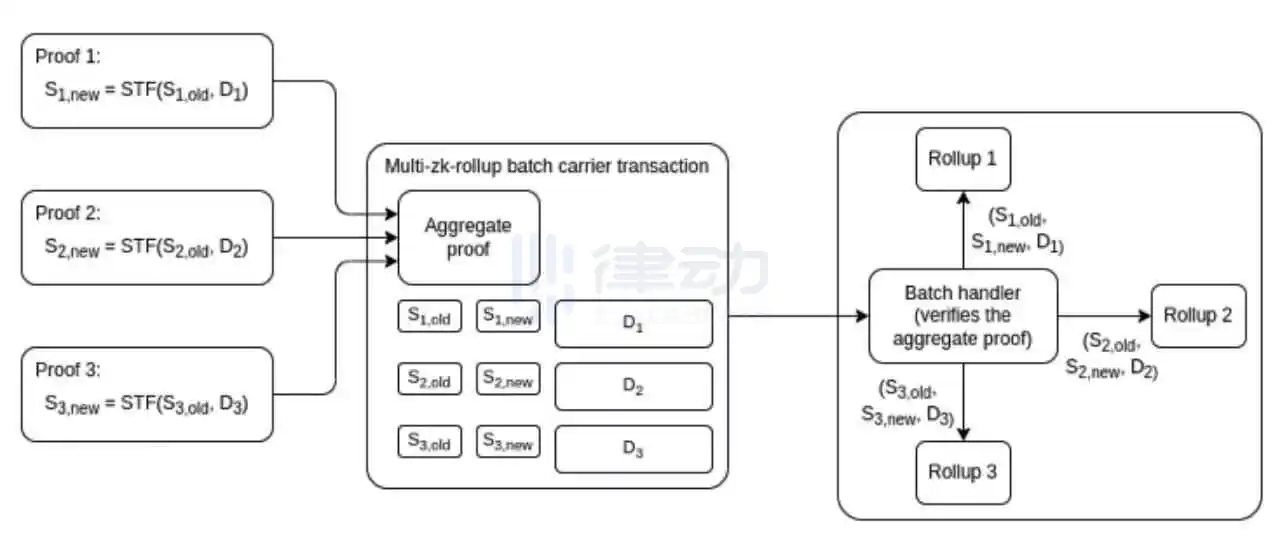 這將是一個開放的協議:任何 ZK-rollup 都可以加入,並且任何批量證明者都可以從任何兼容的 ZK-rollup 聚合證明,並從聚合器獲得交易費用的補償。批處理程序合約將驗證一次證明,然後將一條消息傳遞給每個 rollups, 並帶有該 sollups 的 (Sold, Snew, D) triple. Triple 來自批處理程序合約的事實會被作為證據來證明轉換是有效的。