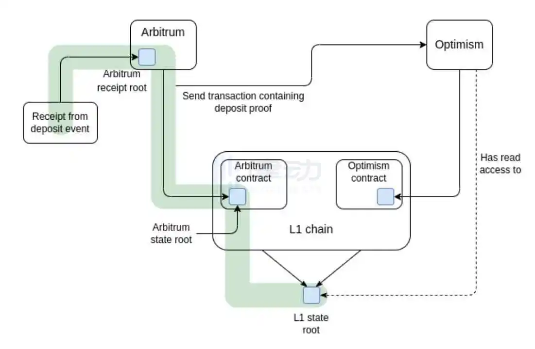 儘管在證明 Arbitrum 上的存款所需的 Merkle 路徑要通過 L1 狀態,Optimism 只需要讀取 L1 狀態根來處理存款 - - - 不需要 L1 交易。請注意,由於 rollups 數據是最稀缺的資源,因此這種方案的實際實現將使用 SNARK 或 KZG 證明,而不是直接使用 Merkle 證明,以節省空間。